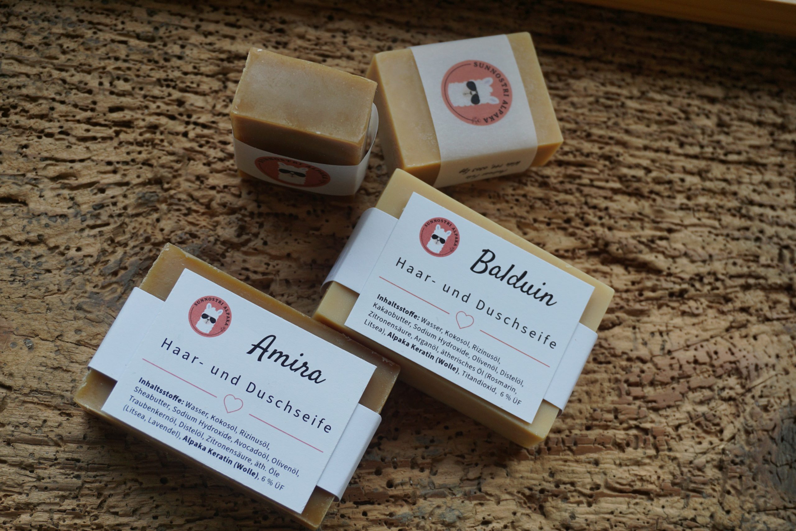 Inhaltsstoffe: Wasser, Kokosöl, Rizinusöl, Sheabutter, Sodium Hydroxide, Avocadoöl, Olivenöl, Traubenkernöl, Distelöl, Zitronensäure, äth. Öle (Litsea, Lavendel), Alpaka Keratin (Wolle) 6% ÜF