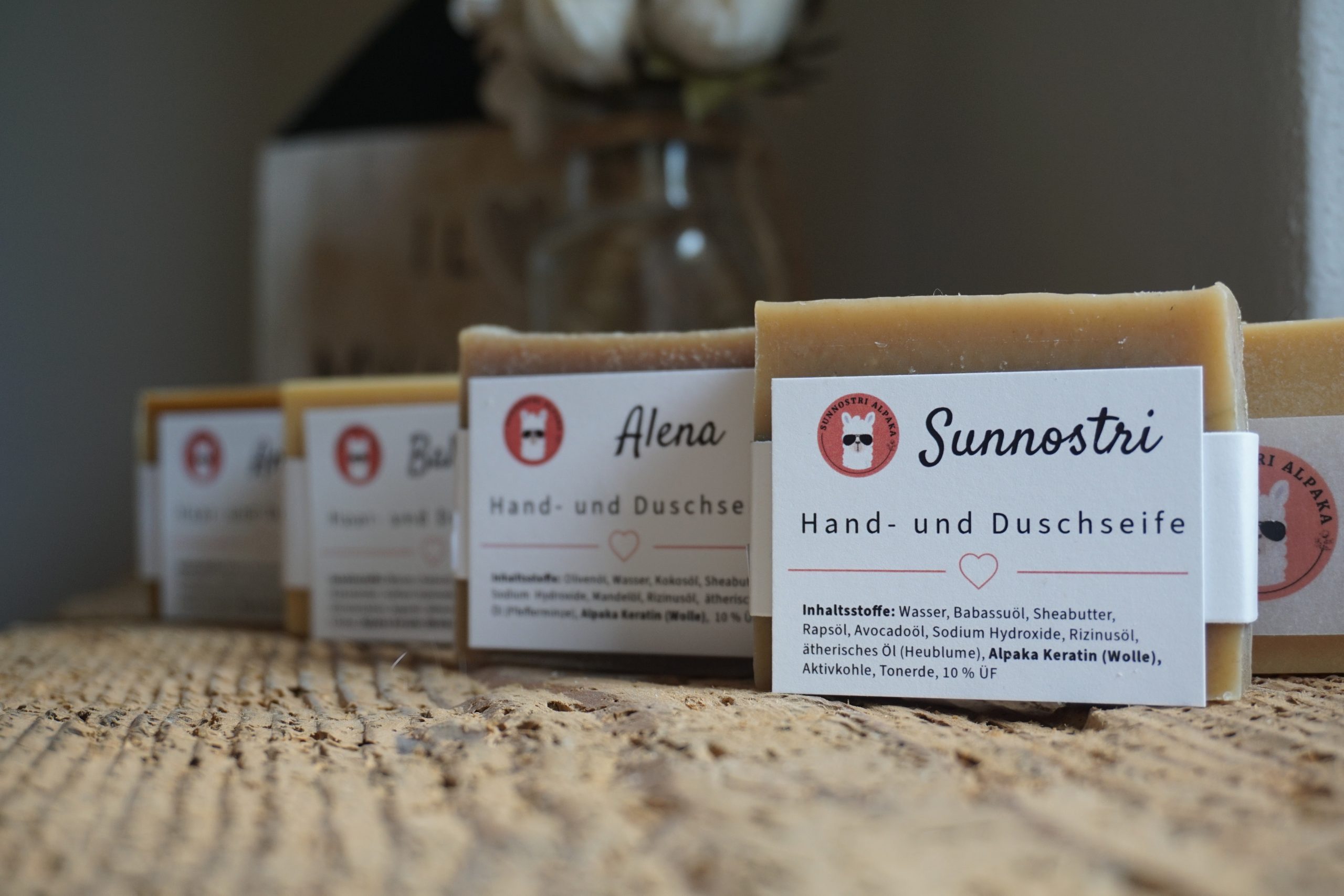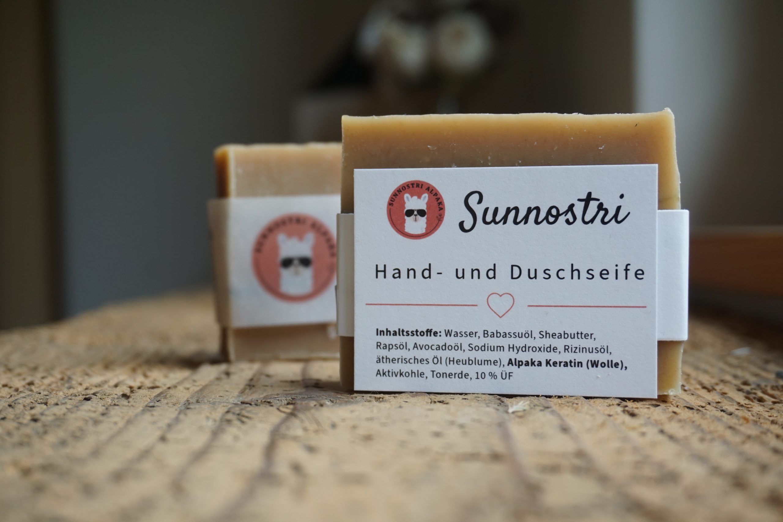 Inhaltsstoffe: Wasser, Babassuöl, Sheabutter, Rapsöl, Avocadoöl, Sodium Hydroxide, Rizinusöl, ätherisches Öl (Heublume) Alpaka Keratin (Wolle), Aktivkohle, Tonerde, 10% ÜF.